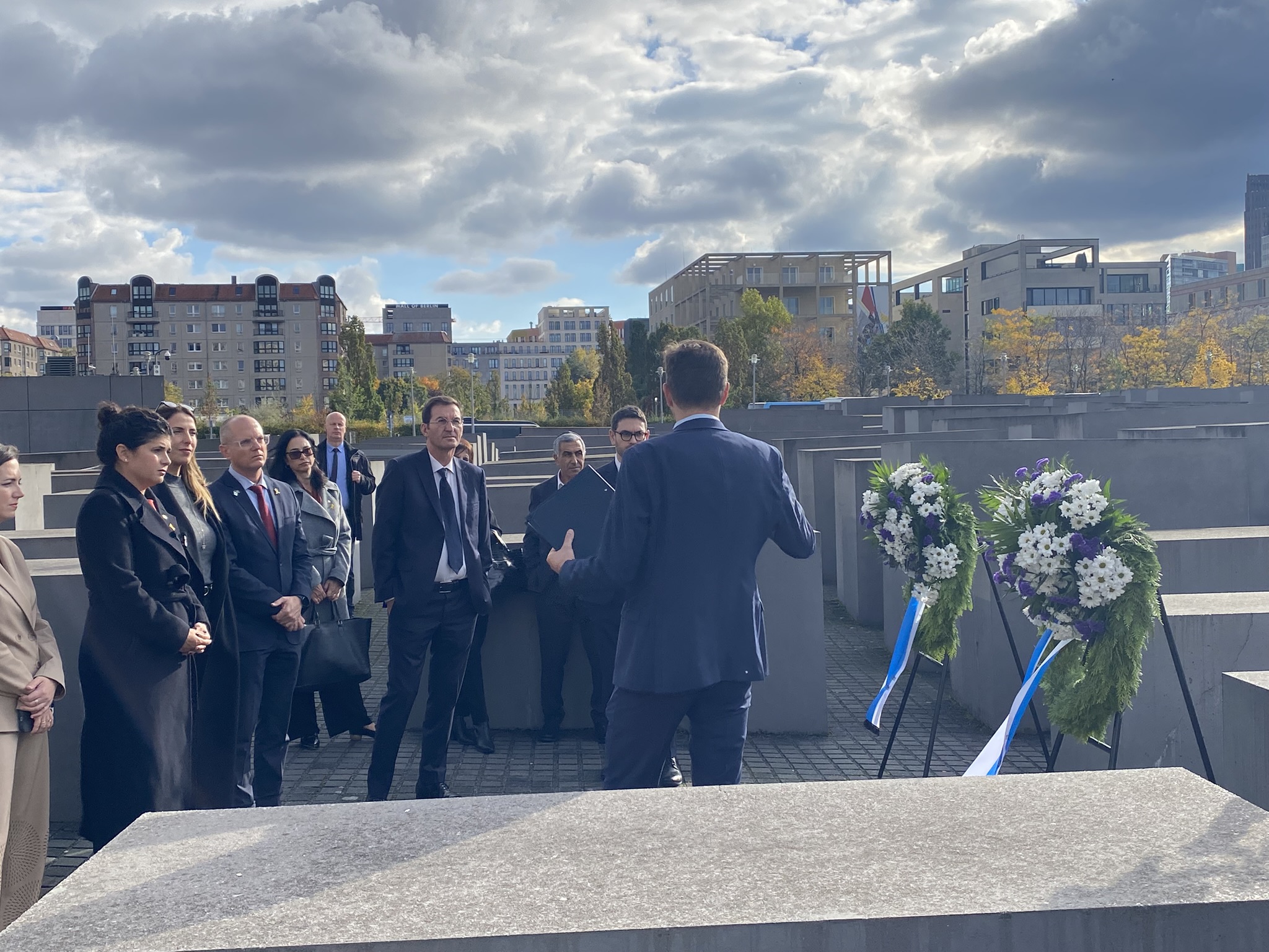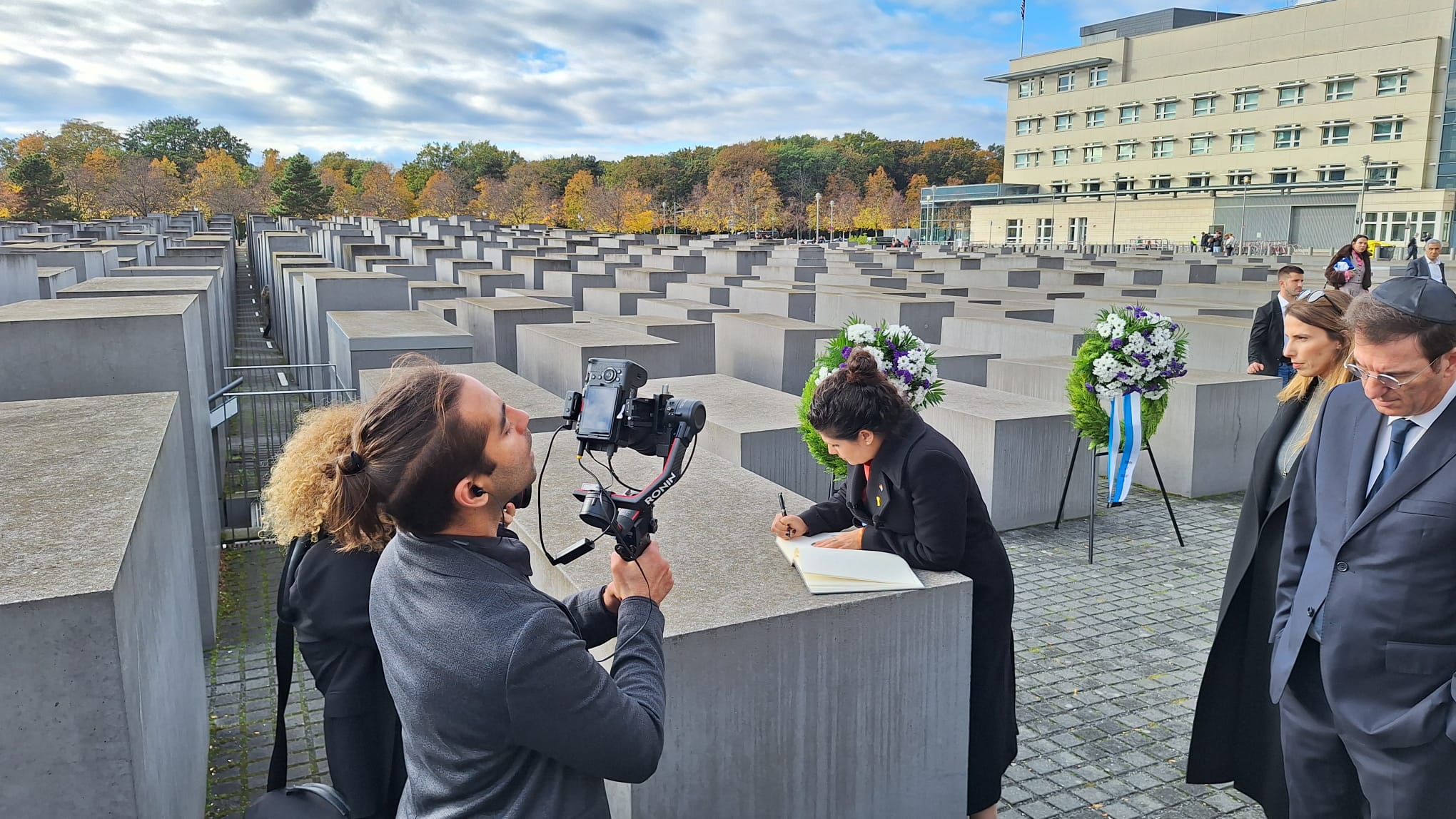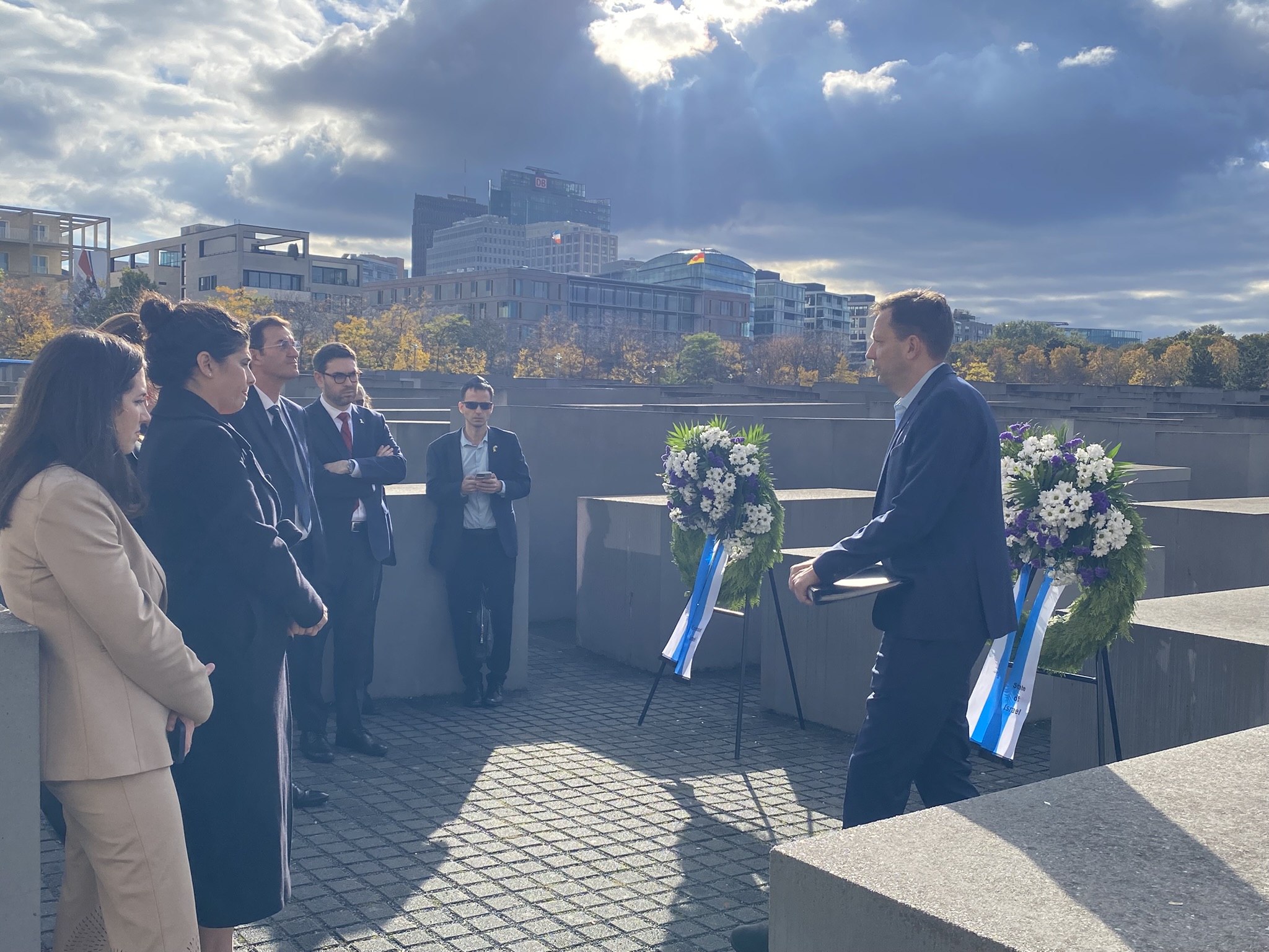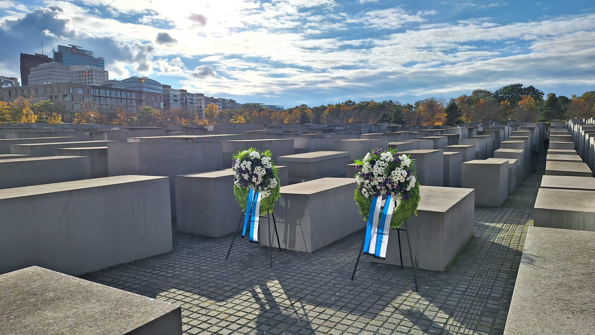 Am Mittwoch, den 15. Oktober 2025, besuchte Sharren Haskel, Vize-Außenministerin des Staates Israel, in Begleitung einiger Abgeordneter der Knesset, das Denkmal für die ermordeten Juden Europas. Sie wurde von Adam Kerpel-Fronius begrüßt und ins Stelenfeld begleitet. Dort sprachen beide einige Zeit über die Entstehung und Bedeutung des Denkmals. Anschließend legten Sharren Haskel, sowie die Angeordneten Boaz Bismuth, Oded Forer und Michal Shir Segman zwei Kränze nieder und trugen sich in das Gästebuch des Denkmals ein.