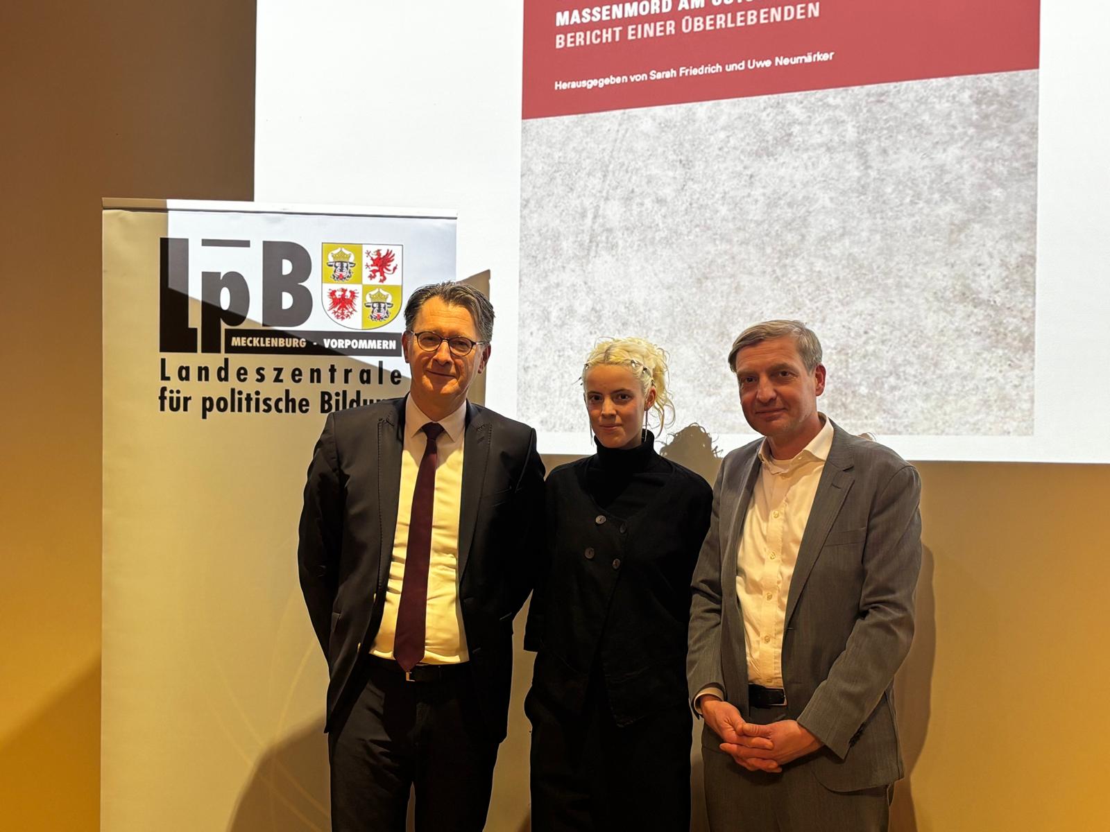 Am Abend des 10. Februars 2026 fand in der Kunsthalle Rostock eine Lesung aus dem Buch »Massenmord am Ostseestrand – eine Überlebende berichtet vom Massaker in Palmnicken« der Holocaustüberlebenden Eva Nagler statt. Zu Beginn der Lesung begrüßten Jochen Schmidt, Direktor der Landeszentrale für politische Bildung, sowie die Staatssekretärin Susanne Bowen, Ministerium für Wissenschaft, Kultur, Bundes- und Europaangelegenheiten. Im Anschluss las Anna Menzel, Schauspielstudentin an der Hochschule für Musik und Theater Rostock, aus dem Buch. Uwe Neumärker, Direktor der Stiftung Denkmal für die ermordeten Juden Europas, umrahmte die Lesung mit historischen Einordnungen, die er zu Beginn sowie zwischen den einzelnen Kapiteln vortrug. Nach der Veranstaltung stand eine Fragerunde für die Gäste offen.