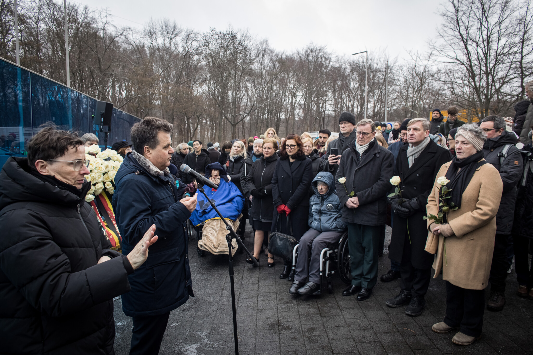 Das Dokumentations- und Kulturzentrum Deutscher Sinti und Roma, der Zentralrat Deutscher Sinti und Roma sowie die Stiftung Denkmal luden am 28. Januar 2026 um 14 Uhr an das Denkmal für die im Nationalsozalismus ermordeten Sinti und Roma ein, um gemeinsam an die 500.000 ermordeten Sinti und Roma Europas und alle anderen Menschen, die dem Nationalsozialismus zum Opfer fielen, zu erinnern. Nach einer Begrüßung von Dotschy Reinhardt, Stellv. Vorsitzende des Zentralrats Deutscher Sinti und Roma, und Uwe Neumärker, Direktor der Stiftung Denkmal, sprach Michael Brand, Antiziganismusbeauftragter der Bundesregierung zu den Gästen. Anschließend folgte die Rede des Überlebenden Dieter Flack. Er gehört zur Minderheit der Sinti. Seine Angehörigen wurden im Mai 1943 nach Auschwitz-Birkenau deportiert und dort ermordet.