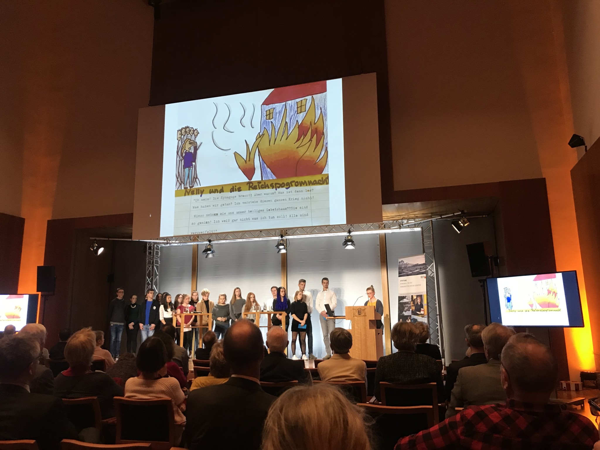 Die Landesvertretung Baden Württemberg lud am 6. November 2018 zusammen mit der Stiftung Denkmal für die ermordeten Juden Europas baden-württembergische Teilnehmerinnen und Teilnehmer, des von der Zentrale für Unterrichtsmedien im Internet (ZUM e.V.) bundesweit ausgeschriebenen Schülerwettbewerbs** »80 Jahre Reichspogromnacht – Was wurde aus den niedergebrannten Synagogen in Deutschland?« ein, ihre Beiträge und Rechercheergebnisse in Berlin der Öffentlichkeit zu präsentieren.