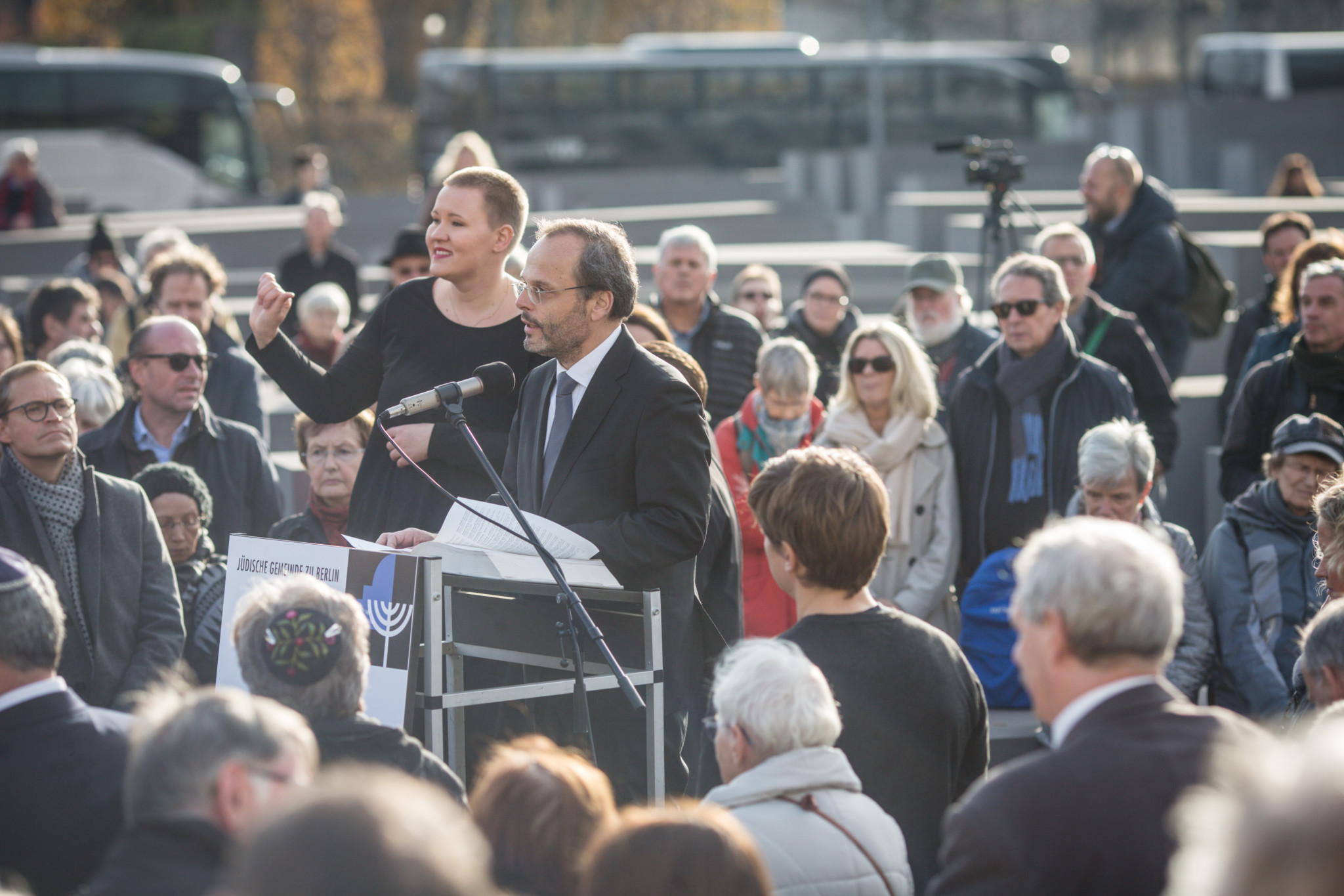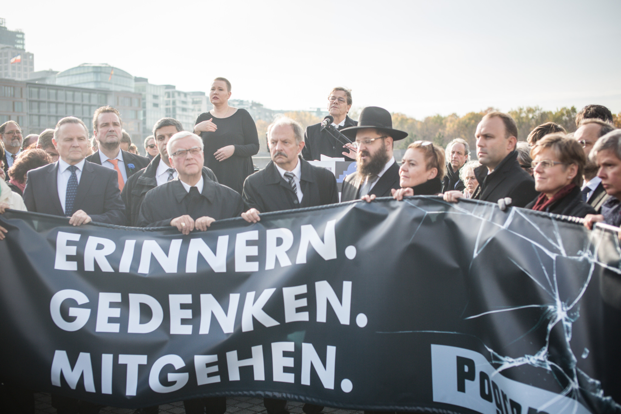 Unter dem Motto »Erinnern. Gedenken. Mitgehen – 80 Jahre Pogromnacht« führte von 13 Uhr bis 14.15 Uhr, ein, von den Kirchen organisierter, »Gedenkweg 2018«, beginnend von der Topographie des Terrors, zum Denkmal für die ermordeten Juden Europa. Der Regierende Bürgermeister, Michael Müller, der Bischof der Evangelischen Kirche Berlin-Brandenburg-schlesische Oberlausitz, Markus Dröge, Erzbischof von Berlin, Heiner Koch, und Felix Klein, Beauftragter der Bundesregierung für jüdisches Leben in Deutschland und den Kampf gegen Antisemitismus, sprachen zu den Teilnehmerinnen und Teilnehmern des Gedenkweges sowie zu Besuchern des Stelenfeldes und der Namenslesung. Lea Rosh, Initiatorin des Denkmals, und Uwe Neumärker, Direktor der Stiftung Denkmal für die ermordeten Juden Europas, lasen acht Biographien aus dem Raum der Namen aus der Ausstellung im Ort der Information vor. Der Gedenkweg 2018 war eine Initiative der Evangelischen Kirche Berlin-Brandenburg-schlesische Oberlausitz, des Erzbistum Berlin, und dem Ökomenischen Rat Berlin-Brandenburg.
