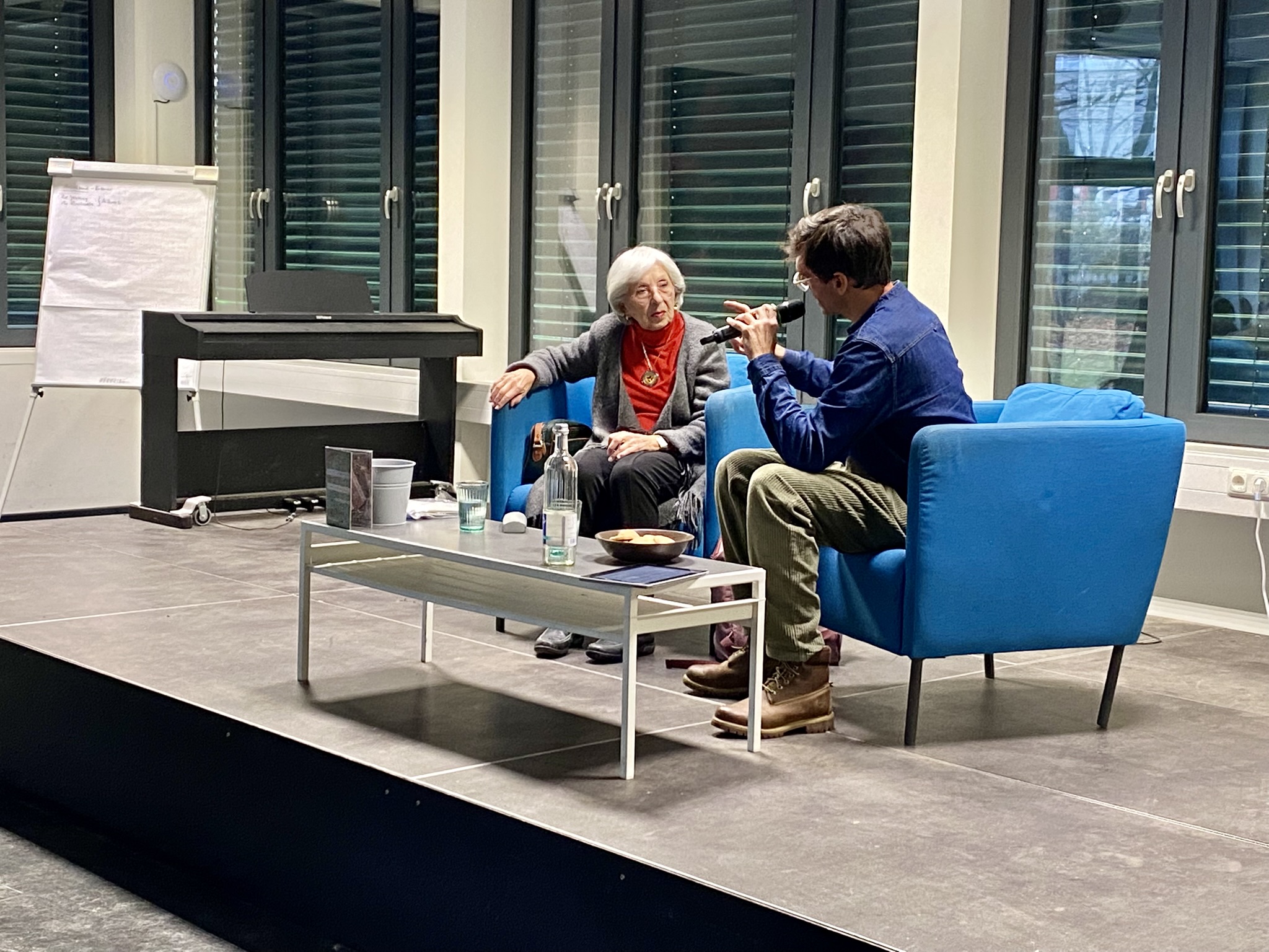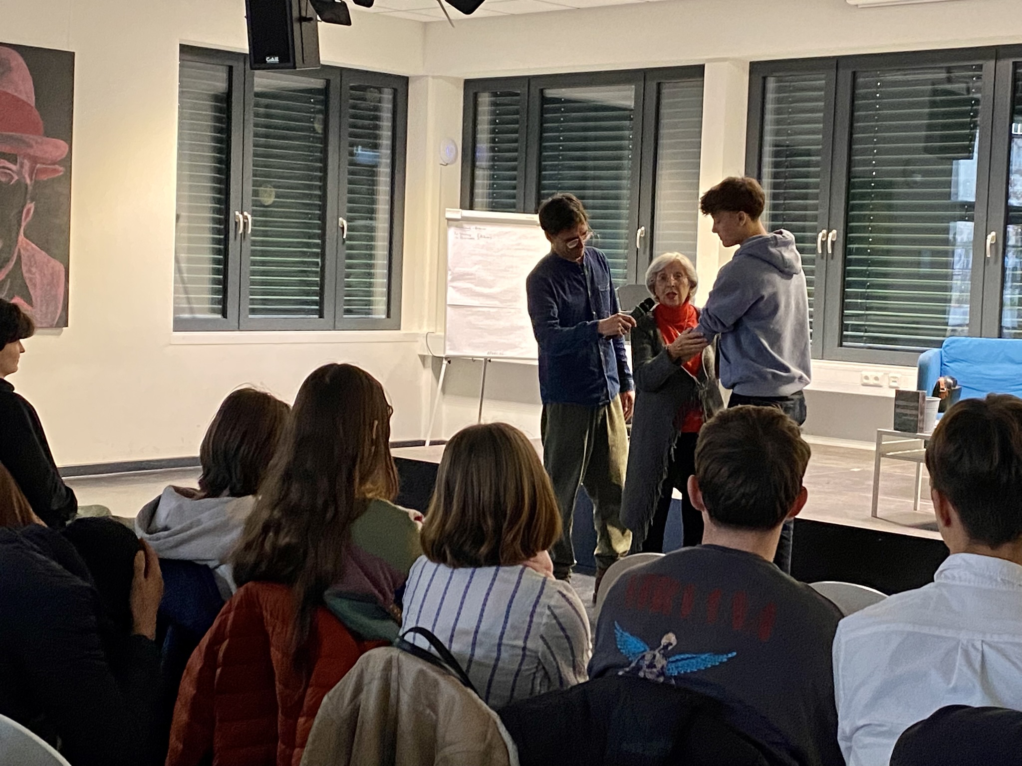 Die 88-jährige Zeitzeugin teilte die Lebens- und Überlebensgeschichte ihres 2023 verstorbenen Mannes Franz Michalski mit den Schüler/-innen. Noch zu Franz‘ Lebzeiten war seine Frau Petra – nach einem Schlaganfall – das Sprachrohr für ihn, während der zahlreichen Zeitzeugenbegegnungen mit alten und jungen Menschen. Die erste Frage gleich zu Beginn lautete: »Wie haben Sie Ihren Mann kennengelernt?« Petra Michalski berichtete, wie sie Franz beim Tanzen mit 16 Jahren in Hamburg kennenlernte und er ihr dabei auf die Zehen trat …