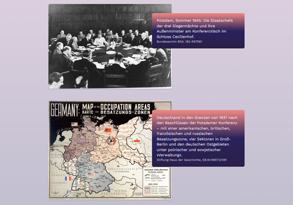 Mit der bedingungslosen Kapitulation der Wehrmacht am 8. Mai und der Kaiserlich Japanischen Armee am 2. September 1945 ist der Zweite Weltkrieg, der mit dem deutschen Angriff auf Polen 1939 begonnen hatte, beendet. Bis zu 65 Millionen Menschen – Soldaten und Zivilisten – sind gewaltsam zu Tode gekommen. Mit bis zu 27 Millionen Opfern haben die Völker der Sowjetunion den höchsten Blutzoll gezahlt. Sechs Millionen europäische Juden sind im Rahmen des nationalsozialistischen Völkermordes ermordet worden, über drei Millionen sowjetische Kriegsgefangene, bis zu 500.000 Sinti und Roma sowie etwa 300.000 behinderte und pflegebedürftige Menschen. Mit der Potsdamer Konferenz im Sommer 1945 werden die Grenzen im Osten des Kontinents neu gezogen. Millionen Menschen müssen ihre Heimat verlassen. Deutschland verliert große Gebiete im Osten, die an Polen und die Sowjetunion fallen, die verbleibenden Teile werden in Besatzungszonen aufgeteilt, aus denen zwei Staaten entstehen. Der Kalte Krieg und der Eiserne Vorhang zwischen dem Westen und der sowjetischen Einflusssphäre im Osten spalten den Kontinent. Erst die Umbrüche in Mittelosteuropa 1989/90 ermöglichen ein Zusammenwachsen Europas.