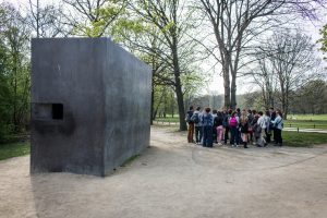 The monument was designed by Michael Elmgreen and Ingar Dragset, built by decision of the German Bundestag and is located in the Tiergarten. The film shown is by the Israeli artist Yael Bartana.